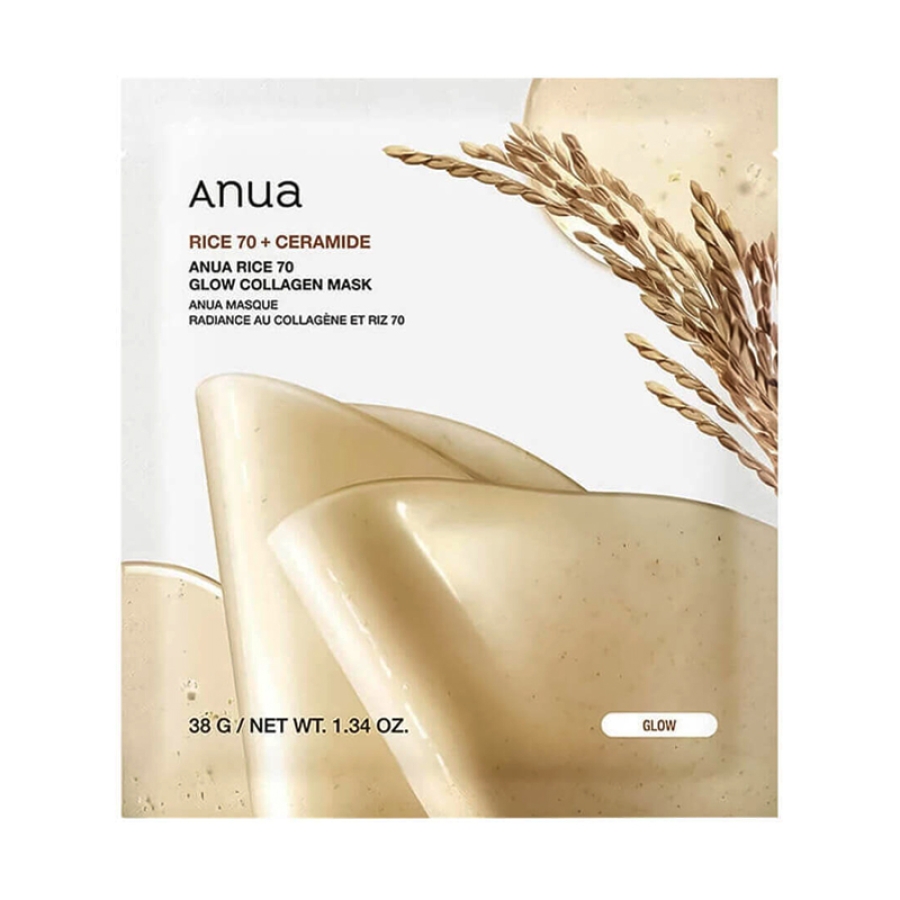 Гидрогелевая маска для сияния кожи с рисом ANUA Rice 70 Glow Collagen Mask увлажняет и разглаживает, придаёт эффект glass skin. Восполняет недостаток влаги, уменьшает сухость и шелушение, укрепляет естественный защитный барьер. Выравнивает микрорельеф, смягчает огрубевшие участки, готовит к нанесению макияжа. Содержит гидролат риса, низкомолекулярный коллаген, церамиды, 8 видов гиалуроновой кислоты, ниацинамид и аллантоин.